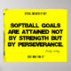 Cette affiche de softball motivationnelle présente une citation de softball de l'auteur et designer Felicity Luckey pour la motivation de l'entraîneur, du joueur et de l'équipe. L'image est celle d'un tissu "déchiré et déchiré" pour le succès de la forme avec des lettres "lâche-fil". Il y a un total de 12 citations de softball dans cette série Great Minds Think Fit™. Les affiches de softball sont disponibles en couleurs vives et audacieuses, bleu denim foncé, et sous forme de collages multi-cotes. La citation motivationnelle sur cette affiche de softball dit : "Les buts du softball ne sont pas atteints par la force mais par la persévérance." ~ Felicity Luckey