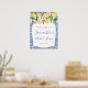 Citrons aquarelle avec roses roses et pivoines sur fond de carrelage bleu cobalt et blanc pour ce panneau de bienvenue élégant pour un mariage ou une baby shower.