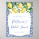 Citrons aquarelle et jolies fleurs sur fond de motif de carreaux bleus et blancs pour ce panneau de bienvenue élégant pour une fête de mariage ou de baby shower.