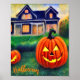 Des citrouilles d’Halloween éclairées à la bougie devant une maison