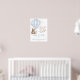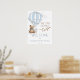 Ce design "We can bearly wait" présente un ours en peluche beige et marron à l'aquarelle avec un arc bleu, assis sur un nuage à côté d'une montgolfière vintage de style toile de Jouy. Cette disposition propre et classique est idéale pour un baby shower à thème neutre et intemporel. La calligraphie élégante est associée à des polices serif classiques.