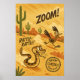 Une impression de bande dessinée amusante et nostalgique présentant une poursuite classique dans le désert entre un géocoucou rapide et un serpent à sonnette enroulé. Avec des couleurs rétro audacieuses et des cactus stylisés, ce design ludique est parfait pour les amateurs d'art animalier vintage et de décoration sud-ouest.