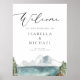 Ce panneau d'accueil mariage présente une scène de lac de montagne aquarelle avec des pins et une police de caractères élégante. Modifiez facilement le libellé *le plus* pour répondre à vos besoins.