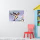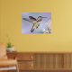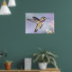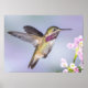 Affiche rose et violette représentant un colibri de calliope volant au-dessus de fleurs de lantana jaunes et roses, montrant ses ailes complètement étirées dans le dos et ses plumes de gorge magenta iridescentes. Belle décoration murale unique pour les amateurs de colibri, de jardin et de nature. Fait amusant : ce colibri est le plus petit oiseau d'Amérique du Nord et porte le nom de la muse Calliope dans la mythologie grecque. Photo prise à Pasadena, Californie.