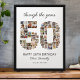 Vous cherchez un moyen spécial d'honorer quelqu'un qui fête ses cinquante ans ? Ce poster personnalisable pour les 50 ans de naissance rassemble des photos significatives qui forment le nombre cinquante. Le titre sentimental 'à travers les ans' ajoute une touche sincère, et vous pouvez personnaliser le texte pour en faire un cadeau unique.