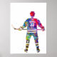 An artistic illustration of a female hockey player holding a stick, portrayed in bold and vibrant watercolor splashes. The energetic composition celebrates women in sports, blending strength, motion, and color in a modern expressive style. Perfect for hockey fans and lovers of dynamic sports art.