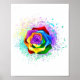 Large, blooming rose with rainbow petals on white background, painted over with splashes of colorful, bright paint. 3d