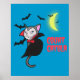 Voici un dessin d'un chat vampire. Le chat vous donne un regard effrayant. Il a des crocs, une cape et une cravate arc. Il y a des chauves-souris qui volent autour du chaton, vers le croissant de lune. Il dit "Count Catula" dans une police sanglante.