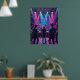 Ce tableau capture un groupe qui se produit sur une scène baignée de lumières vives et colorées de bleu, rose et jaune. L'oeuvre a un style texturé et impasto, avec des touches épaisses et expressives qui transmettent l'énergie d'un événement musical en direct. Les membres du groupe sont en silhouette contre les lumières vives, créant une scène dynamique et immersive d'un concert rock ou pop.