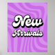 Panneau violet "New Arrivals" au format poster. Conçu pour les commerces de détail tels que les boutiques de mode, pop-up magasins, , magasins d'accessoires, stand artisanal etc.
