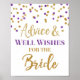 Conseils et voeux pour le panneau de la mariée pour la douche nuptiale en violet foncé et motif confetti or. Veuillez noter que l'effet de parties scintillant n'est que photographique.