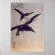 "Crows Flying in Snow" de Ito Sozan (1884 - ?), daté au début des années 1920, a été publié par Watanabe Shozaburo. L'impression d'origine est beaucoup plus petite qu'une impression normale de son jour, l'étant mais 6 5/8 pouces de large par 9 7/8 pouces de haut. Cette belle impression un peu fantaisiste montre "bokashi" (ぼ し), japonais pour "ombrage" ou "dégradé", exécuté avec habileté aux corbeaux et au ciel gris. Le grain de bois est également visible dans le ciel et dans l'ensemble il est une sculpture bien détaillée et une image hivernale saisissante de corbeaux volant dans une tempête de neige.