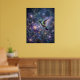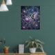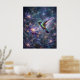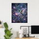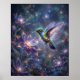 A radiant cosmic hummingbird hovers beside a glowing celestial flower, its delicate wings shimmering with translucent starlight and fine cosmic filaments. Its tiny body glows with jewel-like nebula colors, creating a vibrant and energetic presence. Surrounded by soft mist and floating particles, the scene feels magical and refined. This artwork captures motion, beauty, and lightness, making it ideal for decorative spaces, feminine interiors, and collectors of detailed, high-end fantasy wall art.