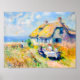Une peinture impressionniste paisible d'un cottage au toit de chaume en bord de mer. Les couleurs chaudes, la verdure luxuriante et la sérénité de l'océan créent une scène côtière cosy et nostalgique.