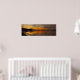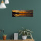 Vue panoramique sur le soleil couchant derrière une colline, avec des couleurs riches dans le ciel et l'eau en dessous.