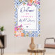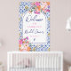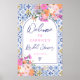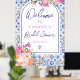 Ce panneau d'accueil de douche nuptiale combine des motifs en céramique bleu italo-méditerranéen avec des fleurs sauvages roses joyeux peints à la main pour un look frais et moderne. L'élégant script de brosse et la forme unique de l'arc créent un design sophistiqué mais dynamique. Parfait pour ajouter une touche de tradition et d'esprit contemporain à votre événement.