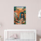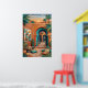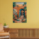 Coucher de soleil dans la cour avec des arches turquoise, des murs en terre cuite, des palmiers, de l'art mural géométrique, des lanternes, des plantes de cactus, des coussins tissés et des tapis à motifs. Ambiance exotique et bohème sous la lueur orange du coucher de soleil. Parfait pour le salon, la chambre à coucher, la décoration globale - impression d'art numérique haute résolution.