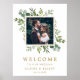 Ce panneau de bienvenue de mariage comporte de l'eucalyptus aquarelle peint, des feuilles vertes et une photo avec un cadre carré doré. Pour une personnalisation plus avancée de ce design, veuillez cliquer sur le lien "Personnaliser davantage". Les articles assortis sont également disponibles.