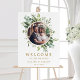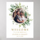 Ce panneau de bienvenue de mariage présente de l'eucalyptus aquarelle peint, des feuilles vertes et une photo avec un cadre de cercle en or. Pour une personnalisation plus avancée de ce design, veuillez cliquer sur le lien "Personnaliser davantage". Des articles assortis sont également disponibles.