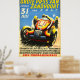 Affiche vintage de sport automobile pour le Grand Prix Grote Prijs van Zandvoort der KNAC / Zandvoort le 31 juillet 1949 avec un design dynamique représentant une course automobile classique à la vitesse vers le spectateur avec le titre audacieux et la date en jaune et blanc contre le ciel bleu ci-dessus et le reste du texte en noir et rouge ci-dessous. La première course automobile dans la Pays-Bas a eu lieu en 1939 à Zandvoort sur un circuit de rue; le circuit Zandvoort a été ouvert en 1948