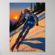 Une peinture à l'huile Art Déco dynamique capturant une raceuse de descente dans un costume bleu cobalt à une vitesse extrême, sa forme géométrique stylisée définie par le dramatique chiaroscuro d'un soleil couchant.