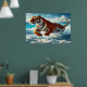 Un majestueux tigre du Bengale, symbole de puissance indomptée, patauge dans l'océan turquoise peu profond, envoyant des gerbes de mousse blanche dans l'air. Les muscles puissants du tigre ondulent sous ses rayures orange et noires emblématiques tandis qu'il se déplace dynamiquement dans l'eau. La scène capture le bleu vif de l'océan, le blanc éclatant des vagues qui éclaboussent et la lumière scintillante du soleil, créant une image de mouvement exaltant et d'énergie brute. Le fond marin doux et flou met en valeur la présence saisissante du tigre.