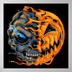 Effrayant jack-o-lanterne qui fond un crâne éffrayant aux yeux bleus.
