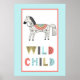 Adorable illustration de style scandinave dans l'art populaire avec le graphique de cheval doux et les lettres qui épellent "enfant sauvage". Illustration sur fond blanc avec une bordure bleu pastel
