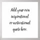 Créez Votre Propre Poster do-it-yourself Citation Inspirationnelle Moderne Carré. Affiches imprimées ou téléchargeables numériques. Ajoutez ici votre propre citation inspirante ou motivationnelle en utilisant la typographie de calligraphie manuscrite moderne. Ou changez de police de caractères ou de taille. Ajoutez, supprimez ou modifiez le nombre de lignes. Texte en noir sur arrière - plan blanc ou changer à votre choix. Idéal pour la sagesse de la vie moderne cite la philosophie, les entrepreneurs, les chercheurs d'objectif, fitness gym sport encouragement ou religieux ou chrétiens citations ou versets inspirants. Parfait pour donner à des équipes, des organisations ou des bénévoles afin que tous reçoivent le même devis personnalisé. Contactez Kris Harty par l'intermédiaire de son magasin pour obtenir de l'aide avec les modifications. Step by Step Inspiration Series disponible exclusivement sur Zazzle à l'adresse zazzle.com/store/KrisHarty, conçu par le designer international Kris Harty. © 2022 Kris Harty Pas à pas Conception inspirationnelle