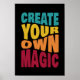 Design de typographie de style rétro coloré avec la citation inspirante "Créez votre propre magie." Parfait pour les rêveurs, les créatifs et tous ceux qui croient en la positivité et l'expression de soi. Un choix idéal pour les t-shirts, les affiches, les peintures murales, les autocollants et autres produits imprimés sur demande.