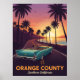 Un convertible turquoise vintage longe une route côtière bordée de palmiers pendant un coucher de soleil animé en Californie du Sud.