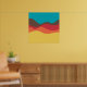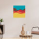 Un design composé de formes irrégulières comme des vagues ou des collines disposées comme un paysage avec une progression de bandes l'une derrière ou sur le dessus d'une autre jouant abstraitement avec la couleur et l'espace. Le design rappelle aussi très bien le son et la musique avec des formes comme des vagues et l'harmonisation des couleurs.