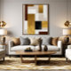 Composition géométrique de cubes dorés et bruns qui se croisent parfaitement. L'art minimaliste et élégant reflète richesse et sophistication, ce qui en fait une pièce d'art parfaite pour les environnements modernes.