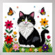 Affiche Cute Black and White Cat, Flowers and Butterflies