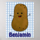 Adorable affiche personnalisée avec une jolie patate de dessin animé brun avec un grand sourire heureux, des points pour les yeux et des bras de bâton. L'arrière - plan est un motif classique de chèque bleu et blanc, en vichy. Sous la pomme de terre en lettres bleues est un modèle pour ajouter votre nom ou autre texte à personnaliser.