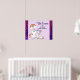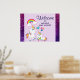 Affiche de baby shower de bienvenue. Conçu avec une licorne mama blanche avec une crinière et une queue colorées fantaisie. Un bébé licorne posé à côté d'elle, avec une sucette verte dans la bouche. Un arc-en-ciel coloré aux nuages moelleux, et quelques étoiles et coeur décorent ce design doux et adorable. Un contour rose et audacieux entourant l'image lui donne une ambiance de doodle à l'enfant. Arrière - plan de couleur pastel violet clair. Les bordures de gauche et de bord ont une fausse parties scintillant rose violet.