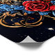 Illustration élégante avec un cygne blanc et une étreinte de cygne noir, entourée de roses rouges et bleus, décorations de coeur doré, ciel nocturne avec étoiles et lune croissant.