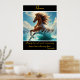 Un cheval de châtaignier captivant court à travers une eau turquoise claire, envoyant des éclats chatants dans toutes les directions. Sa crinière fluide et son énergie dynamique évoquent un puissant sentiment de liberté et de résilience. Un ciel bleu paisible parsemé de nuages blancs doux crée un décor serein. Le mot "Honneur" est affiché en haut dans un élégant script jaune, symbolisant la dignité et la force. Sous le cheval galopant, la citation perspicace d'Aristote — "La dignité ne consiste pas à posséder des distinctions honorifiques, mais à les mériter." — est inscrite avec art dans une police jaune, encadrée par des bordures noires audacieuses pour une finition polie.