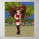 Darby the Roller Derby Fairy est une manga de style shoujo et elle porte un dessus rouge et une jupe avec des coeurs sur ses genoux, des diamants rouges et noirs sur ses chaussettes, et des flammes sur ses patins. Elle a des ailes noires et rouges et de grandes queues de cochon bouclés. Elle patine près des bois devant les champignons aux couleurs magnifiques. Illustration de KLeighE de Hinterland Harmony Art and Illustrations.