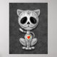 This adorable grey kitten design is decorated with swirls and dot patterns. Small flower pedals circle the pure black eyes in the tradition of the Day of the Dead sugar skulls. The cat is sitting down, looking forward with its tail waving in the background. The over sized head sits on a tiny body which creates a playful, cartoon like appearance. A five point star sits in the middle of the kitten's forehead while a bright red and yellow heart appears in the center of the chest. This cute little cat is a fun and stylish design inspire by the beautiful patterns of the Dead sugar skulls (Jour de la Mort.