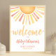 Bienvenue dans votre baby shower avec ce panneau lumineux et joyeux sur le thème du soleil ! Un grand soleil aux rayons éclatants dans les tons jaune, orange, rose et rouge s'installe au sommet, entouré de quelques nuages doux bleu clair pour apporter une touche douce et ludique. Sous le soleil, le mot "Welcome" est affiché dans un amusant mélange de caractères audacieux et de polices modernes, donnant un ton chaleureux et joyeux. En dessous, "Bienvenue au Baby shower de [Nom de maman]" et la date de la douche sont stylisées en coordonnant les couleurs, ajoutant une touche personnalisée pour la journée spéciale. Avec un mélange d'éléments design boho, rétro et moderne, ce panneau fonctionne parfaitement pour un thème baby shower "petit rayon de soleil" ou tout événement lumineux d'inspiration estivale. Le texte et les couleurs peuvent être customisés dans l’éditeur pour correspondre à l’apparence de votre parti. Un grand morceau à placer à l'entrée pour accueillir les invités et lancer une fête heureuse! Disponible soit en version imprimée, soit en tant que fichier numérique téléchargeable à imprimer à la maison ou localement.