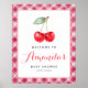 Un joyeux panneau d'accueil sur le thème du cerisier avec deux cerises d'eau encadrées d'une bordure en vichy rose. Personnalisez avec le nom de l’invité d’honneur et la date de l’événement. Parfait pour accueillir les invités et lier votre thème de fête de cerise ensemble.