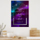 Cosmic Purple Turquoise Sun Moon Stars Affiche de bienvenue Celestial Cosmic Galaxy Space Mariage Affiche de bienvenue Poster présente soleil, lune et étoiles d'argent avec un cadre argenté sur coloré mystique violet, turquoise et bleu arrière - plan cosmique. À l'intérieur du cadre est votre texte personnalisé dans un élégant script de calligraphie blanche. Conçu pour vous par ©2024 Evco Studio www.zazzle.com/store/evcostudio