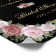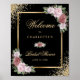 Elégante enseigne de bienvenue à la nuptiale noire et or avec fleurs roses et verdure encadrant les détails de l'événement dans un cadre doré orné de confettis dorés. Éléments correspondants disponibles.