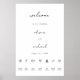 Affiche de bienvenue de mariage à calligraphie minimaliste avec une mise en page chronologique verticale. Le texte est modifiable via les objets de modèle dans l'éditeur Zazzle.