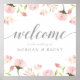 Bienvenue à vos invités mariages avec cet élégant signe d'accueil de fleurs d'aquarelle blush avec une fausse parties scintillant de calligraphie argentée. Personnalisé avec les noms des mariées et/ou des mariés !