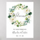 Affiche de bienvenue Mariage fleurie avec une couronne de fleurs blanches aquarelle avec feuillage vert. Pour une personnalisation plus avancée de cette conception, veuillez cliquer sur le bouton "Personnaliser". Des articles correspondants sont également disponibles.