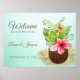 Panneau de bienvenue mariage tropical avec une fleur d'hibiscus rose aquarelle et un bouquet de feuilles de palmiers à l'intérieur d'une noix de coco avec un arrosage de sable doré brillant sur un arrière - plan bleu aqua. Idéal pour la destination, la plage et les mariages d'été. Personnalisez-le avec vos noms et votre date de mariage. Coordonnées avec ma collection de mariages Tropical Paradise.
