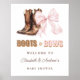 Affiche de bienvenue pour Baby Shower Boots & Bows avec une paire de bottes de cowboy western et un joli nœud ruban féminin.