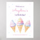Affiche de bienvenue pour fête d'anniversaire avec illustration de glace sucrée dans des couleurs pastel.
